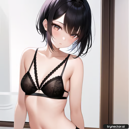 Prompt: An asian young girl with petite body, black short hair, lingerie, innocent face, solo