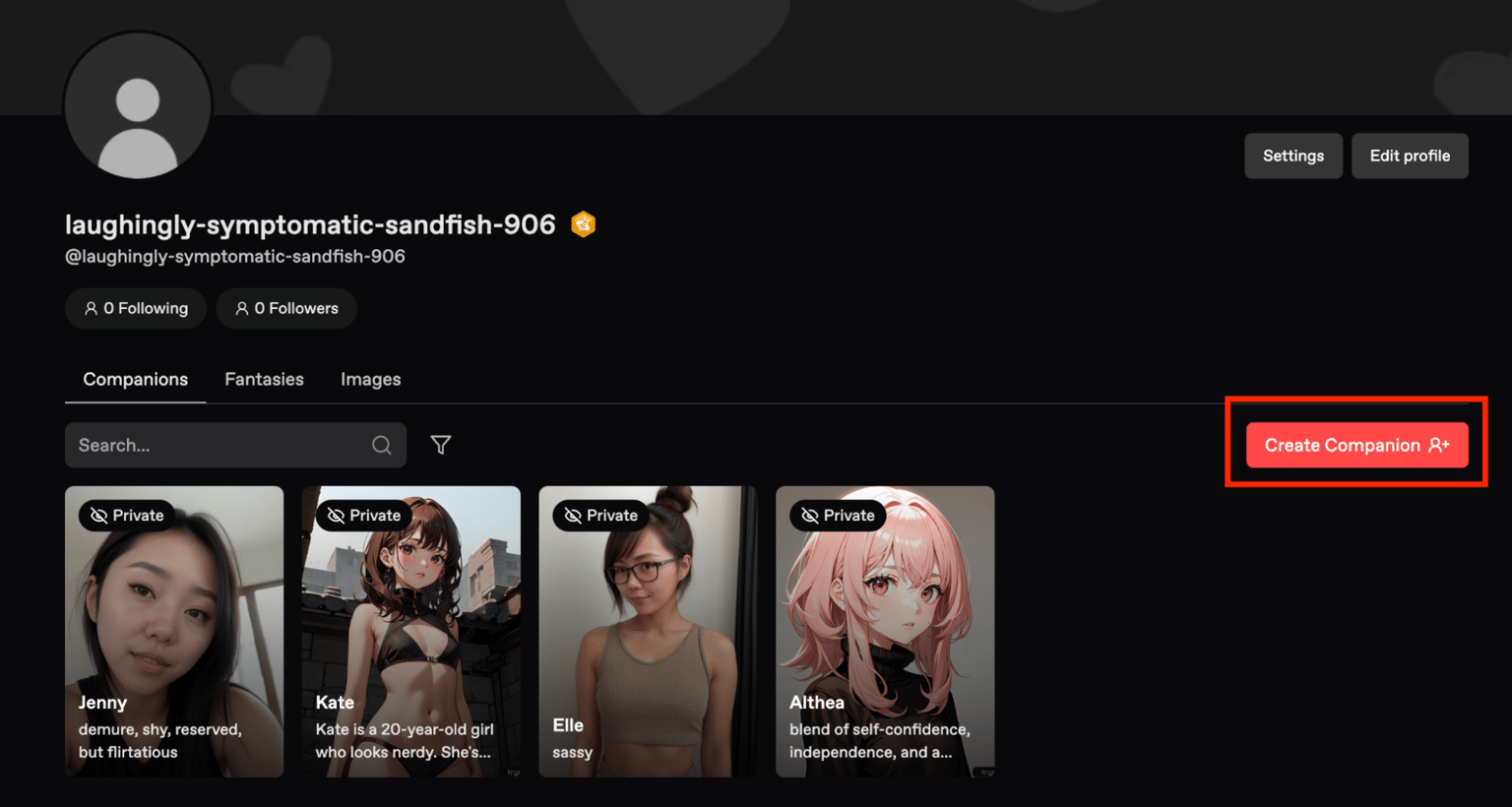Another major feature of Nectar AI is the ability to create a virtual companion that you can interact with. To start, go to your profile and click on the “Create companion” button. Try creating your AI companion.