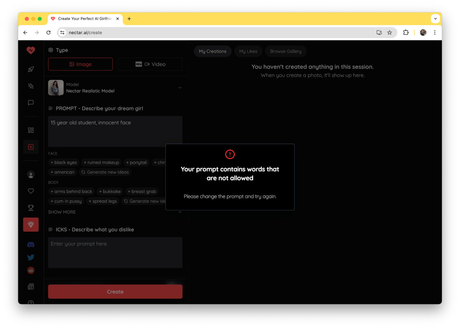 That is why platforms like Nectar AI have put safeguards on the site to avoid potential abuse and misuse. Here’s an example: