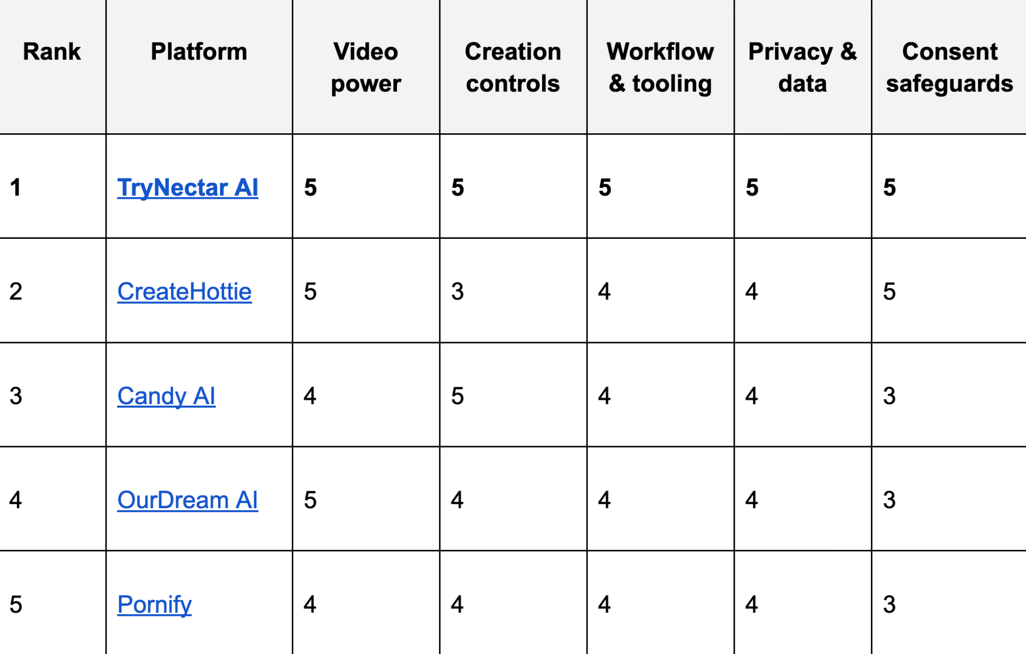 Our scoring model is designed to cover what actually matters when creating AI porn in 2026. Each platform gets 1–5 in each category: