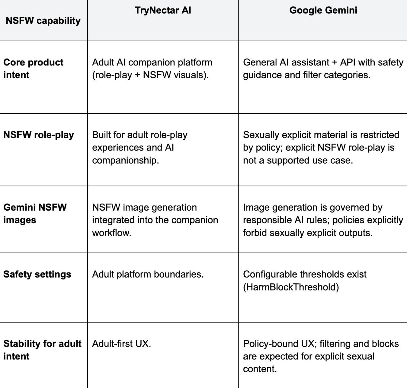 This is the key difference: Gemini is a general AI assistant with strict filtering and policy boundaries; TryNectar is an adult-first companion platform where role-play and visuals are core features.