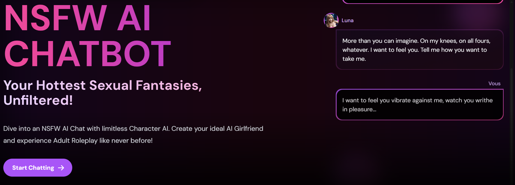 Minsang likhain nila ang kanilang huwarang kapareha, maaaring piliin ng mga gumagamit kung paano kumikilos at gumagawi ang mga tauhang iyon, pati na ang paggawa ng mga eksena na nagpapabanaag ng personal na mga guniguni, damdamin, at mga kagustuhang maglahad ng kuwento. Ang antas na ito ng pagkontrol ay gumawa sa AI na hubad na mga video na higit na nakikilahok kaysa sa tradisyunal na nilalaman ng adulto o static AI na mga larawan.